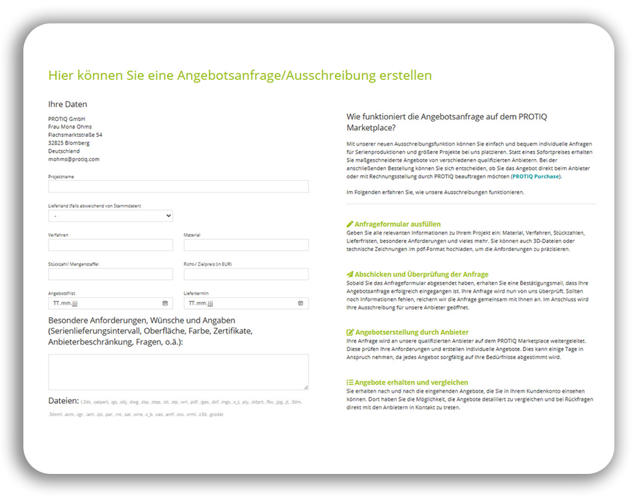 Mit unserer Ausschreibungsfunktion können Sie individuelle Anfragen für Serienfertigungen und größere Projekte einfach und bequem gleich mehreren Dienstleistern stellen. Statt eines automatischen Sofortpreises erhalten Sie maßgeschneiderte Angebote von den qualifizierten Anbietern des PROTIQ Marketplace. Um mit einer Ausschreibung zu starten, klicken Sie einfach auf der Startseite "Projektanfrage starten".